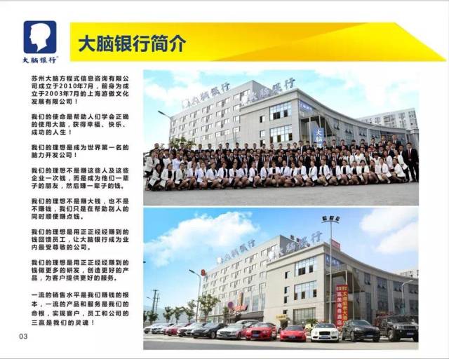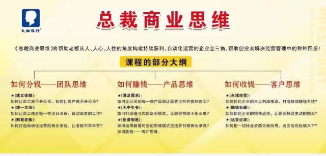 恭喜您,這是大腦銀行第65屆蘇州《總裁商業(yè)思維》開(kāi)課通知!尊敬的 大腦銀行學(xué)員 : 您好!恭喜您報(bào)名參加《總裁商業(yè)思維》課程,《總裁商業(yè)思維》從人性、人心、人欲的角度教你如何構(gòu)建持續(xù)獲利、自動(dòng)化運(yùn)營(yíng)的企業(yè)金三角,幫助老板解決經(jīng)營(yíng)管理中的三大難題: 1、如何分錢一一如何讓員工持續(xù)不斷的跟隨!(公司設(shè)定的機(jī)制必須能成就員工); 2、如何賺錢一一如何讓客戶持續(xù)不斷的買單!(公司研發(fā)的產(chǎn)品必須能造福客戶); 3、如何收錢一一如何讓客戶持續(xù)主動(dòng)的購(gòu)買!(公司設(shè)計(jì)的銷售流程必須傻瓜式); 第65屆《總裁商業(yè)思維》課程,即將于10月11-14日在蘇州隆重舉行!為了保障所有學(xué)員參會(huì)的權(quán)益,沒(méi)有報(bào)名的學(xué)員需繳納學(xué)費(fèi)方可上課,額滿為止。請(qǐng)及時(shí)與您的服務(wù)人員聯(lián)系,感謝您的支持與配合! 65屆《總裁商業(yè)思維》課程表 10月10日下午15:00-22:00簽到! 注:具體課程時(shí)間根據(jù)老師現(xiàn)場(chǎng)宣布為準(zhǔn),此課程時(shí)間僅做參考. 【課程框架】 企業(yè)家必備的三大思維:產(chǎn)品思維、團(tuán)隊(duì)思維、客戶思維!