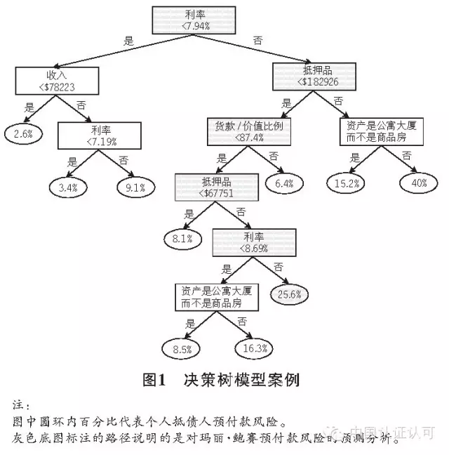 圖1所示為摩根大通(Chase)銀行所使用的決策樹狀圖,以預(yù)測個(gè)人抵債人的預(yù)付款所產(chǎn)生的相關(guān)風(fēng)險(xiǎn)。這種決策樹狀圖基本上是由若干代表價(jià)值試驗(yàn)矩形圖而組成的流程圖結(jié)構(gòu),而每一試驗(yàn)結(jié)果則直接產(chǎn)生為下一級(jí)圖示。每個(gè)下一級(jí)圖示會(huì)引導(dǎo)出一個(gè)新試驗(yàn),直到做出決定為止(在這一案例中,決策就是預(yù)付款的風(fēng)險(xiǎn))。