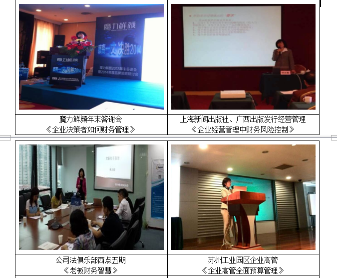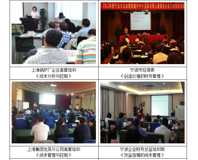 胡文霞老師擁有30多年的財務管理實務及10多年的培訓經驗,將企業(yè)戰(zhàn)略、運營及流程管理與財務融合在一起,整合出一套對企業(yè)從數(shù)字管理角度及成本控制角度提升盈利能力的財務管理體系,擅長企業(yè)財務分析、預算與成本控制、運營資本與現(xiàn)金流管理,具備豐富的財務管理實戰(zhàn)經驗。具有豐富的納稅咨詢和稅務審查實戰(zhàn)經驗,經常受聘為稅務局與企業(yè)培訓,多年來一直參與財稅部門組織的財稅檢查工作,兼任多家企業(yè)財稅顧問,具有稅務師事務所、會計師事務所、上市企業(yè)三重工作經驗。并利用她30多年豐富的實戰(zhàn)工作經驗,先后為國內外大、中型近100家企業(yè)提供財務管理咨詢顧問及培訓服務,幫助企業(yè)改變理財觀念,健全理財系統(tǒng),企業(yè)盈利總體提升50%以上、同時利潤品質得到顯著改善。 財務、稅務咨詢項目 ● 慈溪恒進事業(yè)部會計核算體系建立項目 通過事業(yè)部會計核算體系建立咨詢項目,使該公司能正確理解和領悟傳統(tǒng)會計核算體系與事業(yè)部模式下的會計核算體系的區(qū)別;在執(zhí)行事業(yè)部管理模式的過程中,公司可以發(fā)現(xiàn)可持續(xù)改進的地方;通過事業(yè)部會計核算體系的建立,加強了公司對各事業(yè)部的有效管理,最終實現(xiàn)公司整體戰(zhàn)略目標的達成。 ● 營口光明贏利中心會計核算體系建立項目 通過贏利中心會計核算體系建立咨詢項目,使該公司能正確理解和領悟傳統(tǒng)會計核算體系與贏利中心模式下的會計核算體系的區(qū)別;在執(zhí)行贏利中心管理模式的過程中,公司可以發(fā)現(xiàn)可持續(xù)改進的地方;通過贏利中心會計核算體系的建立,加強了公司對贏利中心的管理,最終實現(xiàn)公司整體戰(zhàn)略目標的達成。 ● 長春吉聯(lián)財務管理咨詢項目 通過財務管理咨詢項目,使公司老板和高管能理解稅務會計、財務會計和管理會計的關聯(lián)性。 通過幫助公司制定符合其公司自身的財務管理模式的《標準財務作業(yè)流程》、《財務部門崗位職責》、《標準管理報表》及《財務管理制度》,可以讓公司老板及高管清楚的看到誰在為公司創(chuàng)造價值、哪個產品在為公司創(chuàng)造價值、哪個區(qū)域在為公司創(chuàng)造價值,為公司規(guī)劃未來、實現(xiàn)戰(zhàn)略目標提供了決策信息。 ● 濟南東岳財務管理咨詢項目 通過財務管理咨詢項目,使該公司的老板和高管能正確理解稅務會計、財務會計和管理會計的關聯(lián)性。 通過幫助公司制定符合其公司自身的財務管理模式的《會計核算體系》、《規(guī)范財務作業(yè)流程》、《財務部門崗位職責》、《標準管理報表》及《建立財務管理制度》,可以讓公司老板及高管清楚的看到誰在為公司創(chuàng)造價值、哪個產品在為公司創(chuàng)造價值、哪個區(qū)域在為公司創(chuàng)造價值,為公司規(guī)劃未來、實現(xiàn)戰(zhàn)略目標提供了決策信息。 近期重復采購課程 2015年1月—10月,上海某高校精品課程《戰(zhàn)略財務規(guī)劃與管理》、《決策者戰(zhàn)略財務管理》、《非財務經理的財務管理》連續(xù)講解12期。被選聘為2015年獨家課程講師。 2015年3月—現(xiàn)在,某網校財稅基礎專業(yè)課程16期。 2015年8月—9月,浙江紹興公開課3期,《基于數(shù)據(jù)的財務經營決策與成本控制》、《非財務經理的財務管理》,參會人員包括市國稅局及各分局稅務人員、所有營改增企業(yè)法人代表及財務負責人。 2015年6月—10月,山東省威海市、臨沂市、菏澤市總裁班7期,《非財務經理的財務管理》,參會人員:市中小企業(yè)總經理、高管。 2015年9月—10月,新疆電信,《非財務經理的財務管理》連續(xù)講解4期。 主講課程 01-《“營改增”最新政策解讀與稅務籌劃課程大綱》