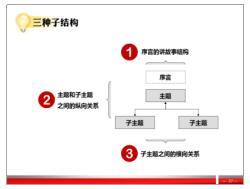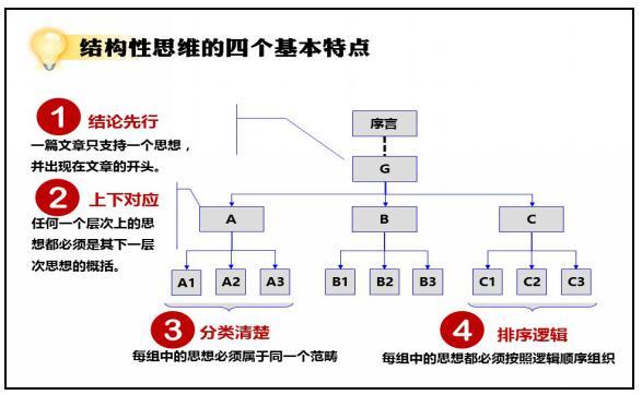 一、結(jié)構(gòu)性思維的四個(gè)基本特點(diǎn) 1.結(jié)論先行 2.上下對(duì)應(yīng) 3.分類清楚 4.排序邏輯 案例練習(xí):構(gòu)建結(jié)構(gòu)性思維 二、結(jié)構(gòu)性思維接受信息 1.識(shí)別信息 2.對(duì)應(yīng)關(guān)系 3.結(jié)構(gòu)呈現(xiàn) 4.語言表達(dá) 案例練習(xí):接受信息的結(jié)構(gòu)化 三、職場(chǎng)溝通的秘訣 1.向上溝通 2.向下溝通 3.平級(jí)溝通