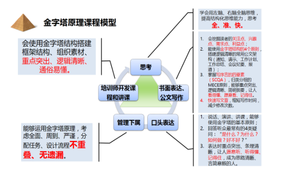 課程時(shí)間:3天,6小時(shí)/天 授課對(duì)象:所有希望提高思考、講話、寫(xiě)作、講課、管理下屬及解決問(wèn)題邏輯性、條理性、效果和效率的人。 授課方法:專(zhuān)題講授+案例分析+小組討論+學(xué)員演練+視頻運(yùn)動(dòng)+角色扮演 課程模型:
