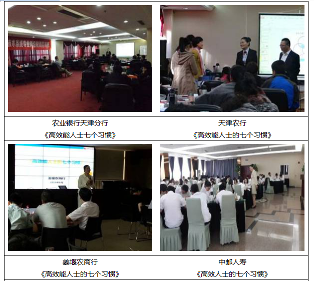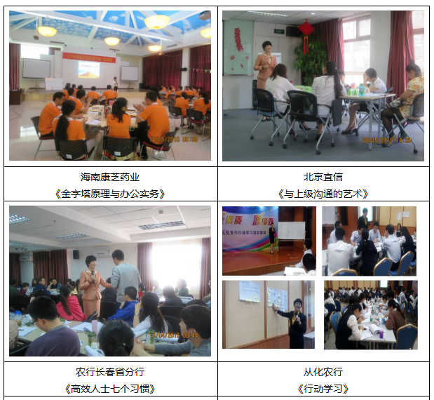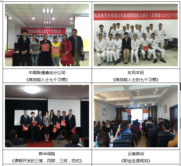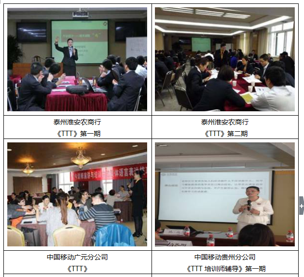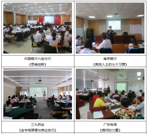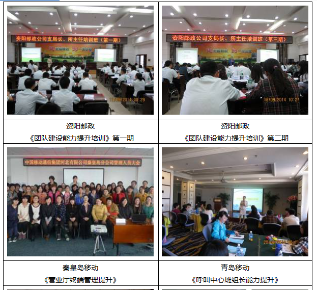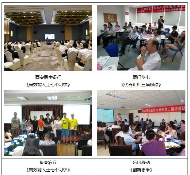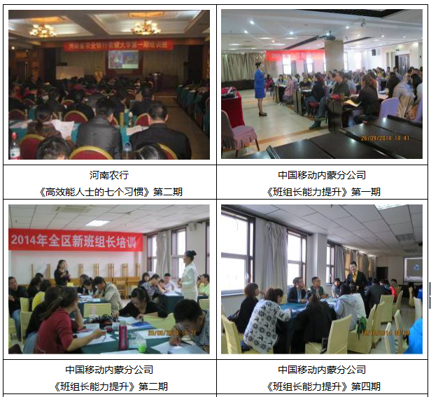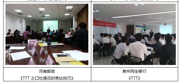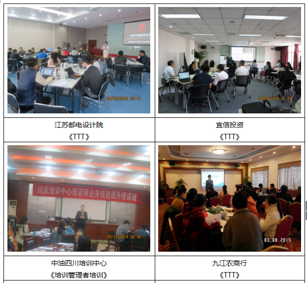 近兩年部分培訓(xùn)客戶: 新鄉(xiāng)移動:《鄉(xiāng)鎮(zhèn)經(jīng)理職業(yè)生涯規(guī)劃》培訓(xùn)滿意度98.5%;《創(chuàng)新思考技能》2期,培訓(xùn)滿意度98%;《智能終端銷售輔導(dǎo)》5期,培訓(xùn)滿意度,98%; 河南移動:《精英店長導(dǎo)師訓(xùn)》滿意度99%;《新銳營業(yè)廳基地講師訓(xùn)》講授初級TTT培訓(xùn)3期,滿意度99%;《新招大學(xué)生入職培訓(xùn)》、《職業(yè)生涯規(guī)劃》、《溝通與影響》,滿意度99.5%;《智能終端銷售》培訓(xùn)5期,授課滿意度99%;《新招大學(xué)生入職培訓(xùn)》、《成為職業(yè)人》、《溝通360》,滿意度99%;《向下管理高爾夫》共進(jìn)行3期,培訓(xùn)滿意度99%; 洛陽移動:《創(chuàng)新思考技能》授課滿意度98.5%; 駐馬店移動:《時間管理》授課滿意度98%;《初級TTT》授課滿意度99%; 河南鶴壁移動:《行動學(xué)習(xí)》項目,共進(jìn)行4期,滿意度99.5%;《行動學(xué)習(xí)》4期,8天,培訓(xùn)滿意度100%;《向下管理高爾夫》共進(jìn)行2期,培訓(xùn)滿意度100%; 河南淇花食用油:《銷售拜訪禮儀》培訓(xùn)滿意度100%;《向下管理高爾夫》培訓(xùn)滿意度98%; 市人民醫(yī)院:《導(dǎo)醫(yī)禮儀》培訓(xùn)滿意度100%; 河南煤化機(jī)械廠:《商務(wù)禮儀》培訓(xùn)滿意度100%; 河南濮陽移動:《向下管理高爾夫》共進(jìn)行4期,培訓(xùn)滿意度98%; 鄭州移動:《初級培訓(xùn)師-瀟灑走上臺》99%; 安徽移動:《鐵三角課程開發(fā)項目》4期,16天,共開發(fā)精品課程14門; 湖南移動:《班組長能力提升》2期4天,滿意度98%; 陜西移動:《創(chuàng)新思考技能》滿意度98%。 通信業(yè):中國移動河南省各分公司、中國移動內(nèi)蒙分公司、昆明怒江分公司、中國電信河北省各分公司、內(nèi)蒙電信、廣東省電信公司數(shù)據(jù)通信局、杭州國信通信公司、中國聯(lián)通集團(tuán)湖北省分公司、中國移動湖北省分公司、中國移動成都省分公司、中國移動廣元分公司、中國聯(lián)通集團(tuán)安徽省分公司、廣東移動通信有限責(zé)任公司廣州分公司、中國電信成都分公司、中國移動騰沖分公司、中國電信廣州分公司、中國移動秦皇島分公司、中國移動貴州分公司、中國移動綿陽分公司、中國移動黔西南分公司、中國移動青島分公司、中國移動內(nèi)蒙分公司(8期)、中國電信廈門分公司、廣東省通信產(chǎn)業(yè)服務(wù)有限公司、中國移動珠海分公司、江蘇省郵電規(guī)劃設(shè)計院、中國移動樂山分公司、中國電信江陰分公司、中國移動茂名分公司、江蘇移動淮安客服中心、中國聯(lián)通康定分公司、中國電信石家莊分公司、中國移動重慶分公司、深圳電信、云南移動 銀行:成都農(nóng)村商業(yè)銀行、鄭州興業(yè)銀行、中國農(nóng)業(yè)銀行杭州省分行、橫山農(nóng)村信用合作聯(lián)社、生命人壽(河南分公司)、廣發(fā)證券、中國銀行陜西省分行、中國農(nóng)業(yè)銀行內(nèi)蒙省分行、南京中國人壽、中國郵政河南省分公司、中國農(nóng)業(yè)銀行天津分行(3期)、寧波銀行、中國銀行西安分行、中國農(nóng)業(yè)銀行溫州分行、中國農(nóng)業(yè)銀行鄭州省分行、姜堰農(nóng)村商業(yè)銀行、中國郵儲銀行贛州分行(2期)、廣州平安保險、河南郵電、廣州郵電、中國郵政資陽分公司(3期)、溫州浙商銀行、中國工商銀行遼源分行、中國農(nóng)業(yè)銀行長春分行、中國建設(shè)銀行福建省分行(3期)、漢口銀行(2期)、淮安農(nóng)村商業(yè)銀行、玉林北流農(nóng)村信用合作聯(lián)社、民生銀行泉州分行、中國工商銀行云山支行、中國工商銀行遼源分行、中國農(nóng)業(yè)銀行長春省分行、 中國農(nóng)業(yè)銀行從化分行、衢州農(nóng)村信用合作聯(lián)社、中國銀行六安分行、南京銀行、西安民生銀行、響水農(nóng)村商業(yè)銀行、九江農(nóng)村信用合作聯(lián)社 其他行業(yè):蘇寧電器、中國電力杭州分公司、河南淇花食用油、河南煤化機(jī)械廠、棗莊中聯(lián)水泥有限公司、中郵人壽、拜耳東北區(qū)KA連鎖、中國石油成都分公司、宜信投資(10期)、瀾滄江華能集團(tuán)(4期)、溫州華儀電器、金華武義金凱德集團(tuán)、東風(fēng)鴻泰控股集團(tuán)有限公司、拜爾醫(yī)藥、凱迪電力有限公司、雙虎家私有限公司、捷富凱有限公司、海南康芝藥業(yè)股份有限公司、四川新雙立汽車有限公司、中國地稅局鄭州分公司、山西電力營業(yè)廳、三九藥業(yè)(深圳)、太平洋保險東莞分公司、深圳巴士集團(tuán)有限公司、羚銳集團(tuán)有限公司、東風(fēng)本田有限公司、廈門德資開關(guān)、梅州國稅局、中國建筑第八工程局有限公司廣西分公司、廣電銀通金融電子科技、中國石化儀征化纖股份有限公司、中核核電運(yùn)營有限公司、361度、三九藥業(yè)、國網(wǎng)中興、新華保險、