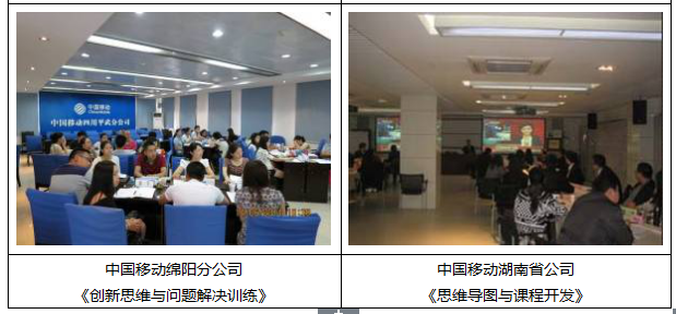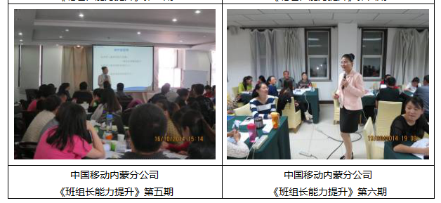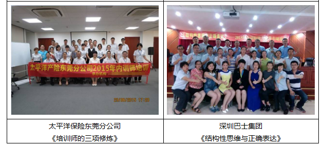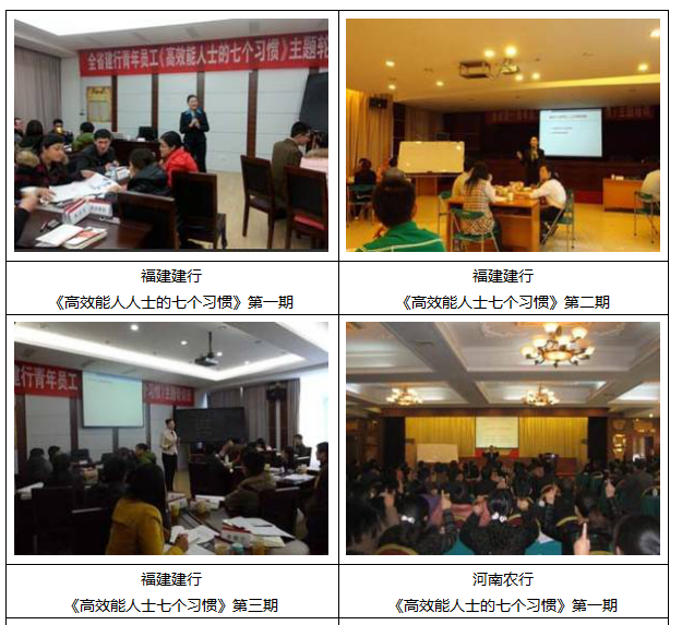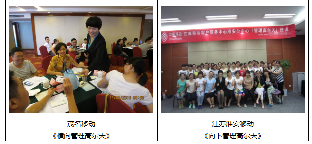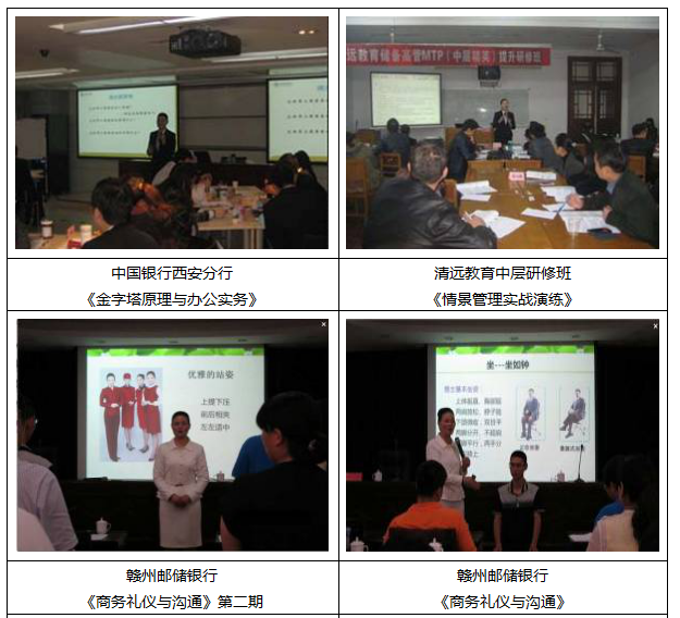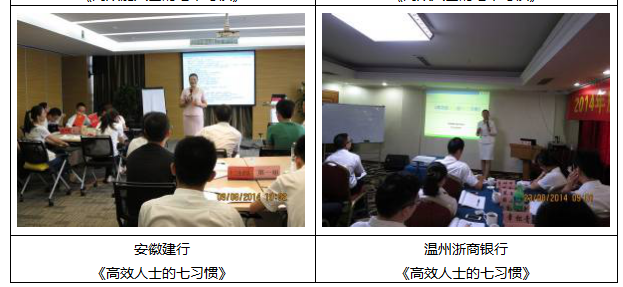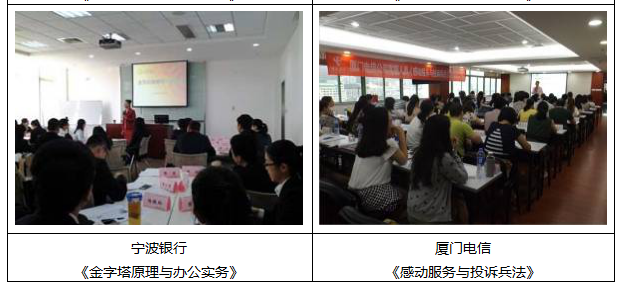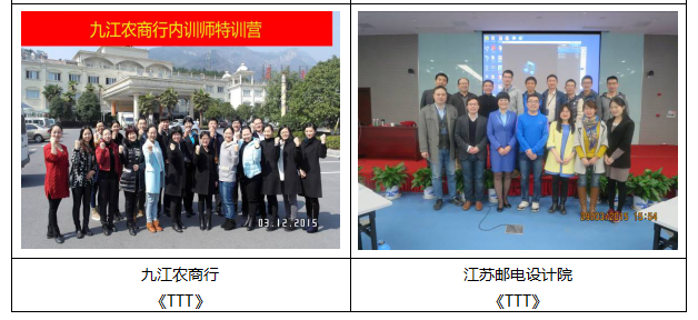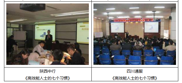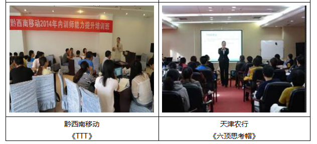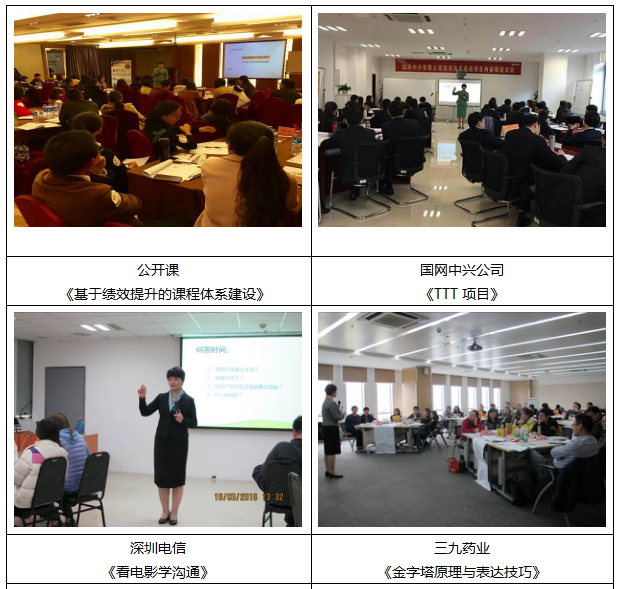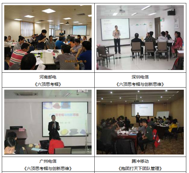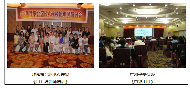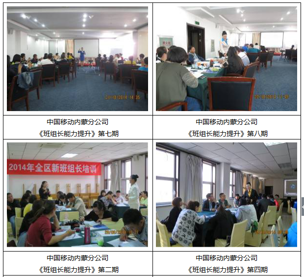 近兩年部分培訓(xùn)客戶: 新鄉(xiāng)移動:《鄉(xiāng)鎮(zhèn)經(jīng)理職業(yè)生涯規(guī)劃》培訓(xùn)滿意度98.5%;《創(chuàng)新思考技能》2期,培訓(xùn)滿意度98%;《智能終端銷售輔導(dǎo)》5期,培訓(xùn)滿意度,98%; 河南移動:《精英店長導(dǎo)師訓(xùn)》滿意度99%;《新銳營業(yè)廳基地講師訓(xùn)》講授初級TTT培訓(xùn)3期,滿意度99%;《新招大學(xué)生入職培訓(xùn)》、《職業(yè)生涯規(guī)劃》、《溝通與影響》,滿意度99.5%;《智能終端銷售》培訓(xùn)5期,授課滿意度99%;《新招大學(xué)生入職培訓(xùn)》、《成為職業(yè)人》、《溝通360》,滿意度99%;《向下管理高爾夫》共進(jìn)行3期,培訓(xùn)滿意度99%; 洛陽移動:《創(chuàng)新思考技能》授課滿意度98.5%; 駐馬店移動:《時間管理》授課滿意度98%;《初級TTT》授課滿意度99%; 河南鶴壁移動:《行動學(xué)習(xí)》項目,共進(jìn)行4期,滿意度99.5%;《行動學(xué)習(xí)》4期,8天,培訓(xùn)滿意度100%;《向下管理高爾夫》共進(jìn)行2期,培訓(xùn)滿意度100%; 河南淇花食用油:《銷售拜訪禮儀》培訓(xùn)滿意度100%;《向下管理高爾夫》培訓(xùn)滿意度98%; 市人民醫(yī)院:《導(dǎo)醫(yī)禮儀》培訓(xùn)滿意度100%; 河南煤化機(jī)械廠:《商務(wù)禮儀》培訓(xùn)滿意度100%; 河南濮陽移動:《向下管理高爾夫》共進(jìn)行4期,培訓(xùn)滿意度98%; 鄭州移動:《初級培訓(xùn)師-瀟灑走上臺》99%; 安徽移動:《鐵三角課程開發(fā)項目》4期,16天,共開發(fā)精品課程14門; 湖南移動:《班組長能力提升》2期4天,滿意度98%; 陜西移動:《創(chuàng)新思考技能》滿意度98%。 通信業(yè):中國移動河南省各分公司、中國移動內(nèi)蒙分公司、昆明怒江分公司、中國電信河北省各分公司、內(nèi)蒙電信、廣東省電信公司數(shù)據(jù)通信局、杭州國信通信公司、中國聯(lián)通集團(tuán)湖北省分公司、中國移動湖北省分公司、中國移動成都省分公司、中國移動廣元分公司、中國聯(lián)通集團(tuán)安徽省分公司、廣東移動通信有限責(zé)任公司廣州分公司、中國電信成都分公司、中國移動騰沖分公司、中國電信廣州分公司、中國移動秦皇島分公司、中國移動貴州分公司、中國移動綿陽分公司、中國移動黔西南分公司、中國移動青島分公司、中國移動內(nèi)蒙分公司(8期)、中國電信廈門分公司、廣東省通信產(chǎn)業(yè)服務(wù)有限公司、中國移動珠海分公司、江蘇省郵電規(guī)劃設(shè)計院、中國移動樂山分公司、中國電信江陰分公司、中國移動茂名分公司、江蘇移動淮安客服中心、中國聯(lián)通康定分公司、中國電信石家莊分公司、中國移動重慶分公司、深圳電信、云南移動 銀行:成都農(nóng)村商業(yè)銀行、鄭州興業(yè)銀行、中國農(nóng)業(yè)銀行杭州省分行、橫山農(nóng)村信用合作聯(lián)社、生命人壽(河南分公司)、廣發(fā)證券、中國銀行陜西省分行、中國農(nóng)業(yè)銀行內(nèi)蒙省分行、南京中國人壽、中國郵政河南省分公司、中國農(nóng)業(yè)銀行天津分行(3期)、寧波銀行、中國銀行西安分行、中國農(nóng)業(yè)銀行溫州分行、中國農(nóng)業(yè)銀行鄭州省分行、姜堰農(nóng)村商業(yè)銀行、中國郵儲銀行贛州分行(2期)、廣州平安保險、河南郵電、廣州郵電、中國郵政資陽分公司(3期)、溫州浙商銀行、中國工商銀行遼源分行、中國農(nóng)業(yè)銀行長春分行、中國建設(shè)銀行福建省分行(3期)、漢口銀行(2期)、淮安農(nóng)村商業(yè)銀行、玉林北流農(nóng)村信用合作聯(lián)社、民生銀行泉州分行、中國工商銀行云山支行、中國工商銀行遼源分行、中國農(nóng)業(yè)銀行長春省分行、 中國農(nóng)業(yè)銀行從化分行、衢州農(nóng)村信用合作聯(lián)社、中國銀行六安分行、南京銀行、西安民生銀行、響水農(nóng)村商業(yè)銀行、九江農(nóng)村信用合作聯(lián)社 其他行業(yè):蘇寧電器、中國電力杭州分公司、河南淇花食用油、河南煤化機(jī)械廠、棗莊中聯(lián)水泥有限公司、中郵人壽、拜耳東北區(qū)KA連鎖、中國石油成都分公司、宜信投資(10期)、瀾滄江華能集團(tuán)(4期)、溫州華儀電器、金華武義金凱德集團(tuán)、東風(fēng)鴻泰控股集團(tuán)有限公司、拜爾醫(yī)藥、凱迪電力有限公司、雙虎家私有限公司、捷富凱有限公司、海南康芝藥業(yè)股份有限公司、四川新雙立汽車有限公司、中國地稅局鄭州分公司、山西電力營業(yè)廳、三九藥業(yè)(深圳)、太平洋保險東莞分公司、深圳巴士集團(tuán)有限公司、羚銳集團(tuán)有限公司、東風(fēng)本田有限公司、廈門德資開關(guān)、梅州國稅局、中國建筑第八工程局有限公司廣西分公司、廣電銀通金融電子科技、中國石化儀征化纖股份有限公司、中核核電運(yùn)營有限公司、361度、三九藥業(yè)、國網(wǎng)中興、新華保險、