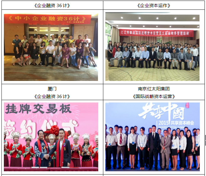 服務(wù)客戶(部分): 中科智聯(lián)控股有限公司 北京錦鴻融資租賃有限責(zé)任公司 北京泊藏珠寶市場(chǎng)有限責(zé)任公司 北京億仟信投資管理有限責(zé)任公司 北京安寶天使科技開發(fā)有限公司 北京安寶天使科技開發(fā)有限公司 北京佳麗天元商貿(mào)有限公司 北京世奇泊藏珠寶有限公司 北京儒信科技發(fā)展有限公司 北京大唐視覺國(guó)際品牌咨詢有限公司 北京斯博賽爾營(yíng)銷顧問有限公司 菲特優(yōu)(北京)汽車信息咨詢有限公司 北京華宜慕森環(huán)境技術(shù)有限公司 優(yōu)子贏嘉國(guó)際教育投資管理(北京)有限公司 中特醫(yī)藥科技北京有限公司 北京藍(lán)美清潔服務(wù)有限公司 北京家務(wù)幫家庭服務(wù)有限公司 聯(lián)華智興(北京)機(jī)電設(shè)備有限公司 北京神思固元科技有限公司 北京沃達(dá)?萍加邢薰 北京中凱潤(rùn)邦科技發(fā)展有限責(zé)任公司 北京貝菲特教育咨詢有限公司 北京思普瑞斯文化傳媒有限公司 北京普拉斯馬科技有限公司 北京東方智創(chuàng)文化傳媒有限公司 北京萬(wàn)達(dá)鼎盛會(huì)議會(huì)展有限公司 北京創(chuàng)意圈營(yíng)銷顧問有限公司 北京巖立川科技服務(wù)有限公司 巨升元云科技(北京)研究院 北京奧斯普科技有限公司 北京市鶴庭春醫(yī)藥科技有限公司 北京鴻聚豪國(guó)際商貿(mào)有限公司 仁愛家和(北京)康復(fù)輔具科技有限公司 北京印氏岳靈生發(fā)用品有限公司 坤泉國(guó)際投資管理(北京)有限公司 北京創(chuàng)思拓科貿(mào)有限公司 成都新華文軒傳媒有限公司 南京紅太陽(yáng)集團(tuán) 長(zhǎng)沙青創(chuàng)會(huì) 廣東省銀行協(xié)會(huì) 部分授課及活動(dòng)照片: