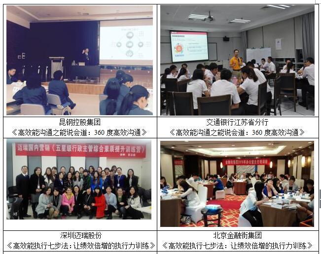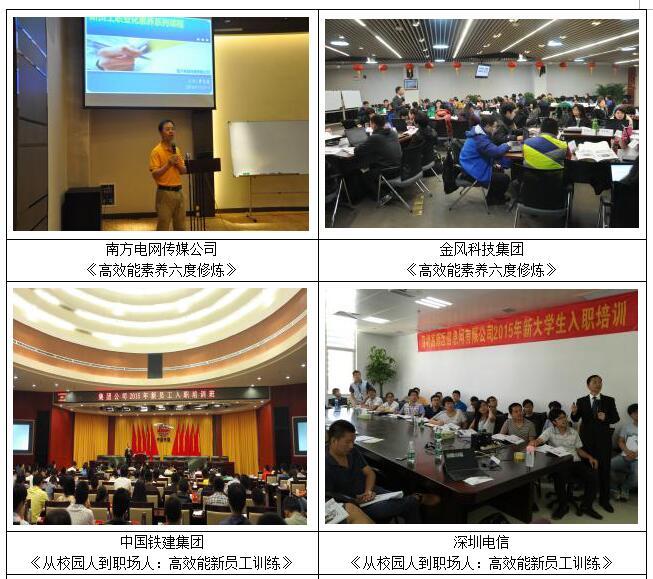 部分服務(wù)過(guò)客戶: 【一、大型集團(tuán)公司】(43家) 中國(guó)神華集團(tuán)(4期)、中國(guó)鐵建集團(tuán)(2期)、中海石油、中國(guó)平安、國(guó)家電網(wǎng)、南方電網(wǎng)、葛洲壩集團(tuán)、東風(fēng)鴻泰集團(tuán)、昆鋼控股集團(tuán)、大唐國(guó)際股份(2期)、華潤(rùn)集團(tuán)、東芝集團(tuán)(2期)、步步高集團(tuán)、海南航空、一汽大眾、百度公司、中郵保險(xiǎn)、深圳電信(10期)、深圳地鐵、深圳邁瑞股份(3期)、深圳能源集團(tuán)、深圳競(jìng)?cè)A電子(2期)、深圳紅嶺創(chuàng)投、廣東信源集團(tuán)(6期)、廣州珠江集團(tuán)、廣州京寫集團(tuán)、廣州鴻利光電股份、廣州民航信息公司、意拉德國(guó)際集團(tuán)、金風(fēng)科技集團(tuán)(2期)、北京金融街集團(tuán)、上海申彤集團(tuán)、大連商品交易所(2期)、株洲高科集團(tuán)、江蘇濱投集團(tuán)、南昌水利集團(tuán)、江西中煙贛州卷煙廠(3期)、廣西水利電力集團(tuán)、武漢燎原模塑公司、廈門天地集團(tuán)、安徽鈺誠(chéng)集團(tuán)、成都電視臺(tái)、成都印鈔公司…… 【二、銀行】(22家) 1.郵政儲(chǔ)蓄銀行 郵政儲(chǔ)蓄銀行廣東省分行(6期)、郵政儲(chǔ)蓄銀行江西省分行(3期)、郵政儲(chǔ)蓄銀行吉林省分行、郵政儲(chǔ)蓄銀行重慶分行、郵政儲(chǔ)蓄銀行河南信陽(yáng)支行…… 2.中國(guó)農(nóng)業(yè)銀行 農(nóng)業(yè)銀行天津市分行(6期)、農(nóng)業(yè)銀行江西省分行(2期)、農(nóng)業(yè)銀行北京分行、農(nóng)業(yè)銀行山東淄博分行、農(nóng)業(yè)銀行山西晉城分行…… 3.農(nóng)商行 東莞市農(nóng)村商業(yè)銀行(4期)、廣東省農(nóng)村信用社聯(lián)合社、陜西省武功縣農(nóng)村信用合作社聯(lián)合社、貴陽(yáng)烏當(dāng)區(qū)信用聯(lián)社、、嘉興禾城農(nóng)商銀行、南京泰興農(nóng)商行…… 4.其它銀行 交通銀行江蘇省分行(2期)、光大銀行武漢分行(2期)、中國(guó)建設(shè)銀行柳州分行、北京銀行上海分行、四川遂寧市商業(yè)銀行、東莞銀行…… 【三、教育機(jī)構(gòu)、政府機(jī)關(guān)等】(11家) 廣州郵電學(xué)院(6期)、廣州市政府系統(tǒng)培訓(xùn)中心(3期)、廣東博碩光華(2期)、貴州遵義煙草專賣局(2期)、大連港教育培訓(xùn)中心、上海業(yè)余科技學(xué)院、岳陽(yáng)市中小企業(yè)服務(wù)中心、南昌一佳名師講堂、中山市公積金管理中心、太原市各機(jī)關(guān)企事業(yè)單位、四川涼山州國(guó)資委……