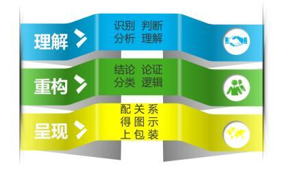 1.理解:識(shí)別、判斷、分析、理解 2. 重構(gòu):結(jié)論、論證、分類、邏輯 3. 呈現(xiàn):配關(guān)系、得圖示、上包裝