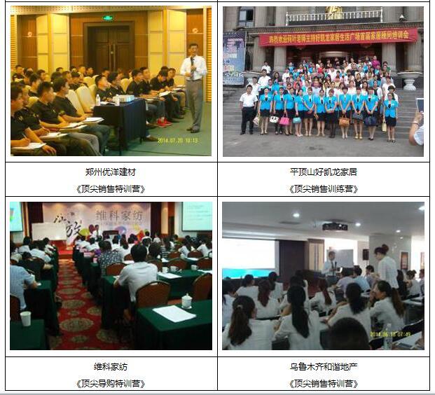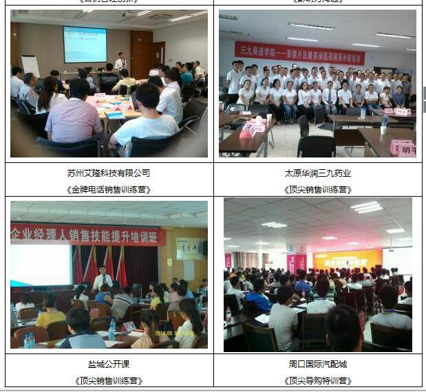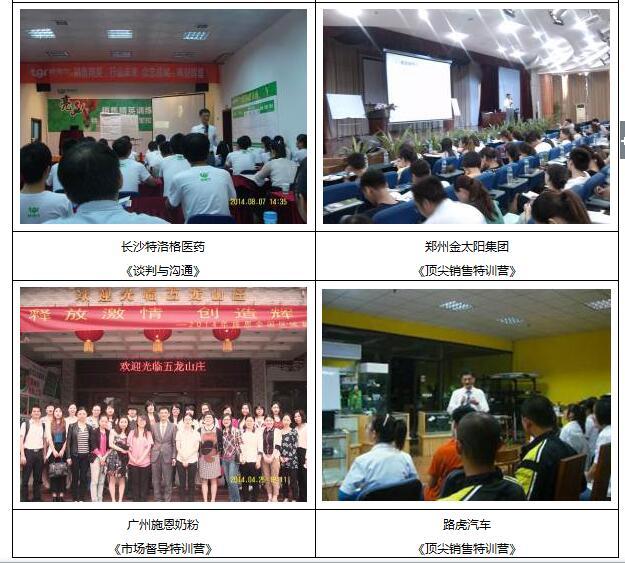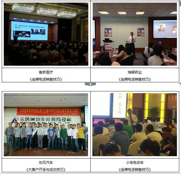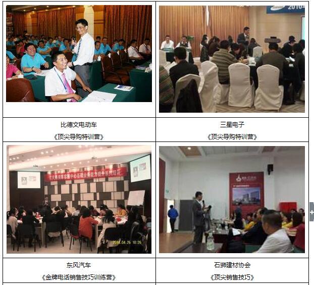 成功案例: 雷克薩斯汽車、路虎汽車、廣本汽車、奧迪汽車、奇瑞汽車、東風(fēng)汽車、新大洲本田、北京運(yùn)良汽車貿(mào)易、新大洲本田摩托、比德文電動(dòng)車、周口國(guó)際汽配城、北京法國(guó)樂(lè)華梅蘭建材超市、北京建材商貿(mào)城、唐山市萬(wàn)嘉建材城、華威家居、浙江省久盛地板、深圳潤(rùn)萬(wàn)達(dá)羅馬瑞達(dá)墻紙、維科家紡、羅萊家紡、易初蓮花、意大利蜜蜂瓷磚、紅星美凱龍、飛利浦照明、永州皓志稀土材料有限公司、泉州市納川管材、廣東歐創(chuàng)不銹鋼、天津潤(rùn)茂貴金屬、廣東歐創(chuàng)不銹鋼、石獅建材協(xié)會(huì)、東北高速泉州東高管業(yè)、顧家家居、上海浦星、百安居、大連世海偉業(yè)集團(tuán)。寶潔、中國(guó)石化、沃爾瑪、好又多、樂(lè)購(gòu)、好麗友食品有限公司、施恩奶粉、重慶寶怡食品 、福建老知青山茶油、修正藥業(yè)、華潤(rùn)三九、西研藥妝化妝品、華濱投資有限公司、北京宗源廣告、方正寬帶、北京鼎橋通訊、阜新銀行、金太陽(yáng)教育、優(yōu)洋飲品瑞陽(yáng)制藥、廈門金日制藥有限公司、廈門文灶藥業(yè)、廈門鷺燕醫(yī)藥連鎖、福建省惠好醫(yī)藥連鎖、福建省永惠醫(yī)藥連鎖、蘭州市德仁堂醫(yī)藥連鎖、廈門宏仁醫(yī)藥、保定冀龍藥業(yè)、福建省恒生醫(yī)藥連鎖、蘭州市老百姓醫(yī)藥連鎖、現(xiàn)代陽(yáng)光健康管理集團(tuán)、杭州能可愛(ài)心醫(yī)療科技、廈門鷺燕醫(yī)藥連鎖、福建省永惠醫(yī)藥連鎖、蘭州市德仁堂醫(yī)藥連鎖、金日集團(tuán)、北京天合樂(lè)仁醫(yī)藥有限公司、。廣東華威家居、、吉林盛邦房地產(chǎn)、新疆和諧地產(chǎn)、廈門建發(fā)、廈成房地產(chǎn)、美聯(lián)房產(chǎn)、二十一不動(dòng)產(chǎn)、新城創(chuàng)宏房地產(chǎn)、蘇州維景房地產(chǎn)、重鋼集團(tuán)中興房地、刑臺(tái)中北集團(tuán)……北京大學(xué)總裁班、廈門總工會(huì)、廈門社會(huì)勞動(dòng)保障局、遼寧省中道管理總裁班、CAC中加國(guó)際教育機(jī)構(gòu)、北京華通教育、沈陽(yáng)市中小企業(yè)培訓(xùn)中心、北京國(guó)富經(jīng)濟(jì)研究院、蘇州大學(xué)、華東師大、浙江大學(xué)、寧波諾丁漢大學(xué)、上海交通大學(xué)、職業(yè)指南頻道、中海油、ECCO愛(ài)步鞋業(yè)、圣達(dá)威服裝、北京圣普服裝、南通天驕服飾、阿里巴巴、殼牌中國(guó)、北京水晶石數(shù)字科技、蘇州科達(dá)科技有限公司、世紀(jì)源博科技有限公司、武漢楚譽(yù)電子工程公司、蘇州能健電氣有限公司、中國(guó)國(guó)旅股份有限公司、北京北辰旅游、三星電子、廈門文儀電腦、新飛冰箱、青島金嶺電器、中國(guó)出口信用保險(xiǎn)公司、北京安東物流、北京聲色廣告有限公司、中國(guó)人保呼叫中心、東風(fēng)乘車客服中心、北京晶客博雅營(yíng)銷策劃、…… 部分客戶領(lǐng)導(dǎo)評(píng)價(jià): 何老師的課程很精彩,生動(dòng)演繹了銷售的本質(zhì)與技巧,將銷售的“道、法、術(shù)”娓娓道來(lái),親切而有內(nèi)涵,何老師以他高度的敬業(yè)精神、飽滿的精神狀況、淵博的知識(shí)以及松弛有度的授課風(fēng)格,征服了我,在短短三天課堂中,讓所有學(xué)員們都成為何老師的追隨者,很震撼! 我們非常期待和何葉老師再次“攜手共贏,決勝終端”! ——深圳潤(rùn)萬(wàn)達(dá)-意大利羅馬瑞達(dá)墻紙董事長(zhǎng) 陳偉強(qiáng) 何老師的培訓(xùn)風(fēng)格非常務(wù)實(shí),很注重培訓(xùn)前的市場(chǎng)調(diào)研,在還沒(méi)有正式簽約的情況下,深入我店及競(jìng)爭(zhēng)對(duì)手百安居數(shù)個(gè)店面與銷售人員交談,總結(jié)了非常詳實(shí)、針對(duì)性很強(qiáng)的培訓(xùn)方案,培訓(xùn)效果立竿見(jiàn)影,得到我們公司上下的一致好評(píng)! ——法國(guó)樂(lè)華梅蘭中國(guó)北京科興店店長(zhǎng) 張輝 何老師的“絕對(duì)成交——金牌銷售人員的6步6力訓(xùn)練”在我們久盛地板的09年經(jīng)銷商年會(huì)上,給我們久盛地板的全國(guó)經(jīng)銷商老板、店長(zhǎng)、導(dǎo)購(gòu)精英上了一堂“生動(dòng)的、翔實(shí)的、很有實(shí)操實(shí)戰(zhàn)”的絕對(duì)課程!課程非常滿意率(10分)高達(dá)96.6%! ——浙江久盛地板有限公司營(yíng)銷副總 趙興才 何葉老師不愧是營(yíng)銷專家,講的非常生動(dòng)、易于理解,何老師能駐扎在我們連云港就好了,我們的銷售業(yè)績(jī)就不怕不突破、不提升了! ——浙江久盛地板有限公司連云港經(jīng)銷商老板 湯成巧 受益匪淺,何葉老師今天的課講的太好了,所講到的都是我們實(shí)際銷售工作上常碰到的難題,現(xiàn)在回去就有好方法了,肯定能服務(wù)好每個(gè)久盛客戶,有機(jī)會(huì)想請(qǐng)何葉老師來(lái)九江指導(dǎo)! ——浙江久盛地板有限公司九江經(jīng)銷商老板 胡生好 金日的成功離不開(kāi)金日人的共同努力!金日人也隨著集團(tuán)的成長(zhǎng)而成長(zhǎng)。何葉就是集團(tuán)公司一步步扎扎實(shí)實(shí)從市場(chǎng)一線成長(zhǎng)起來(lái)的優(yōu)秀代表。我曾戲稱:“何葉虛弱的外表極像文弱的秀才,內(nèi)在的才氣也頗具秀才氣!”但他卻有著和他外表反差極大的執(zhí)著與激