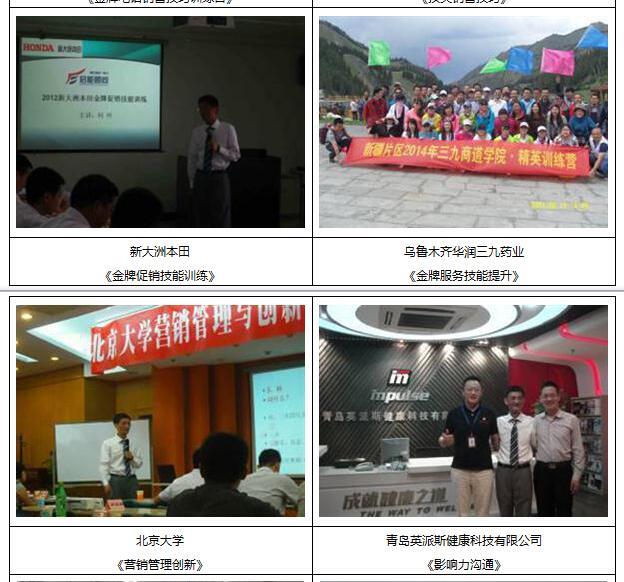 實(shí)戰(zhàn)經(jīng)驗(yàn): 1998年-2008年加入當(dāng)時(shí)“金日集團(tuán)-先后擔(dān)任區(qū)域銷售總監(jiān)、總經(jīng)理助理及集團(tuán)內(nèi)訓(xùn)師。進(jìn)公司前4年為集團(tuán)公司產(chǎn)品暢銷北京、華北市場(chǎng),精耕細(xì)作,足跡踏遍“北京、天津、唐山、石家莊、太原、秦皇島、呼和浩特、邯鄲、滄州、鄂爾多斯、包頭、保定”等城市,放眼全國(guó)21省市自治區(qū),逐步總結(jié)了:東南西北顧客的消費(fèi)購(gòu)買心理、不同性格顧客的購(gòu)買習(xí)慣,使得培訓(xùn)更有的放矢接地氣。由于市場(chǎng)一線導(dǎo)購(gòu)人員及銷售人員銷售能力的大力提升,金日產(chǎn)品一躍成為行業(yè)終端門店顧客購(gòu)買的第一品牌,金日導(dǎo)購(gòu)也成為眾多超市挖人搶人的圍攻對(duì)象,“金日黃埔軍!庇纱嗽跇I(yè)界聲名顯赫!這地幾年來(lái)采集積累了大量的門店銷售、超市銷售的一手銷售案例,并且把市場(chǎng)的一手案例編入自己的課程教材中。何老師認(rèn)為課程的核心堅(jiān)持原創(chuàng)、堅(jiān)持以市場(chǎng)一線案例為原則,也正因此,何老師的課程倍受市場(chǎng)部銷售人員歡迎!統(tǒng)籌集團(tuán)全國(guó)近1萬(wàn)名促銷導(dǎo)購(gòu)及1千余名終端銷售人員的培訓(xùn)工作!并受到集團(tuán)和學(xué)員的一致好評(píng)。