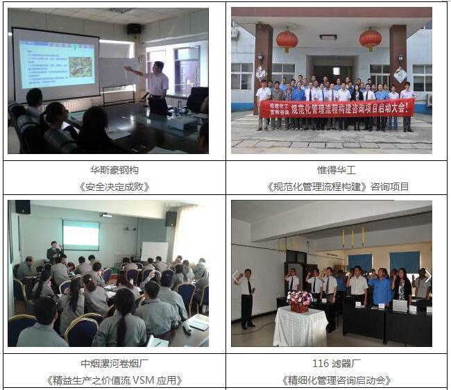 部分成功案例: 116過濾器(平原濾器): 通過咨詢輔導落地,存貨由咨詢前的1770萬降到四個月后的780萬,下降56%;訂單準交率由原來的不到35%,提升到85%;生產(chǎn)計劃達到周計劃和3日滾動計劃的較佳模式;銷售人員由以前存貨扣款約為工資的25%,下降到不足5%;倉庫整改后,帳物卡相符率從68%,提升至99%;將干膠水時長由24H,調整為6H;卷邊工藝從25件/H,提升至85件;卷圓工藝從8臺老機且效率低下,調整為2臺新機+3臺老機的狀態(tài),效率提升30%,工藝改善強力支持了生產(chǎn)過程,將交期由4天提前至最快2.5天交付。續(xù):長期聘任為董事長特別顧問。 天光科技: 以咨詢模式進駐企業(yè),通過現(xiàn)場指導及導入精細化管理模式,結合IE手法,動員公司全體成員齊心協(xié)力,不斷攻關和優(yōu)化管理,公司4個月后各項數(shù)據(jù)發(fā)生顯著變化:訂單準交率由原來65%達到92.5%;制程直通合格率從調研時的74%提升到91.4%;提升了17.6%;車間員工休息時間由原來每月休息1天到現(xiàn)在平均休息2.5天,以前經(jīng)常加班到12點,到現(xiàn)在最多加班至21:30;庫存成品由原來1264萬元減少至586萬,減少了53.64%;生產(chǎn)周期由原來的平均9天壓縮為5天;車間人均產(chǎn)值由原來的每月1.21萬元提升到1.88萬元,增長55.4%。 雄星鋁業(yè): 以生產(chǎn)現(xiàn)場管理為切入點,2個月時間讓車間交貨準時率由56%提升到85%,順利將庫存式生產(chǎn)模式過渡為按單生產(chǎn)模式,通過流程簡化和價值分析,將該公司的交貨周期從15天壓縮到8天,協(xié)助公司完善ERP系統(tǒng),使管理流程有效的透過系統(tǒng)進行運作,固化了運營管理運作,至項目結束共執(zhí)行提案22項,為公司節(jié)能增效可量化價值達200多萬。